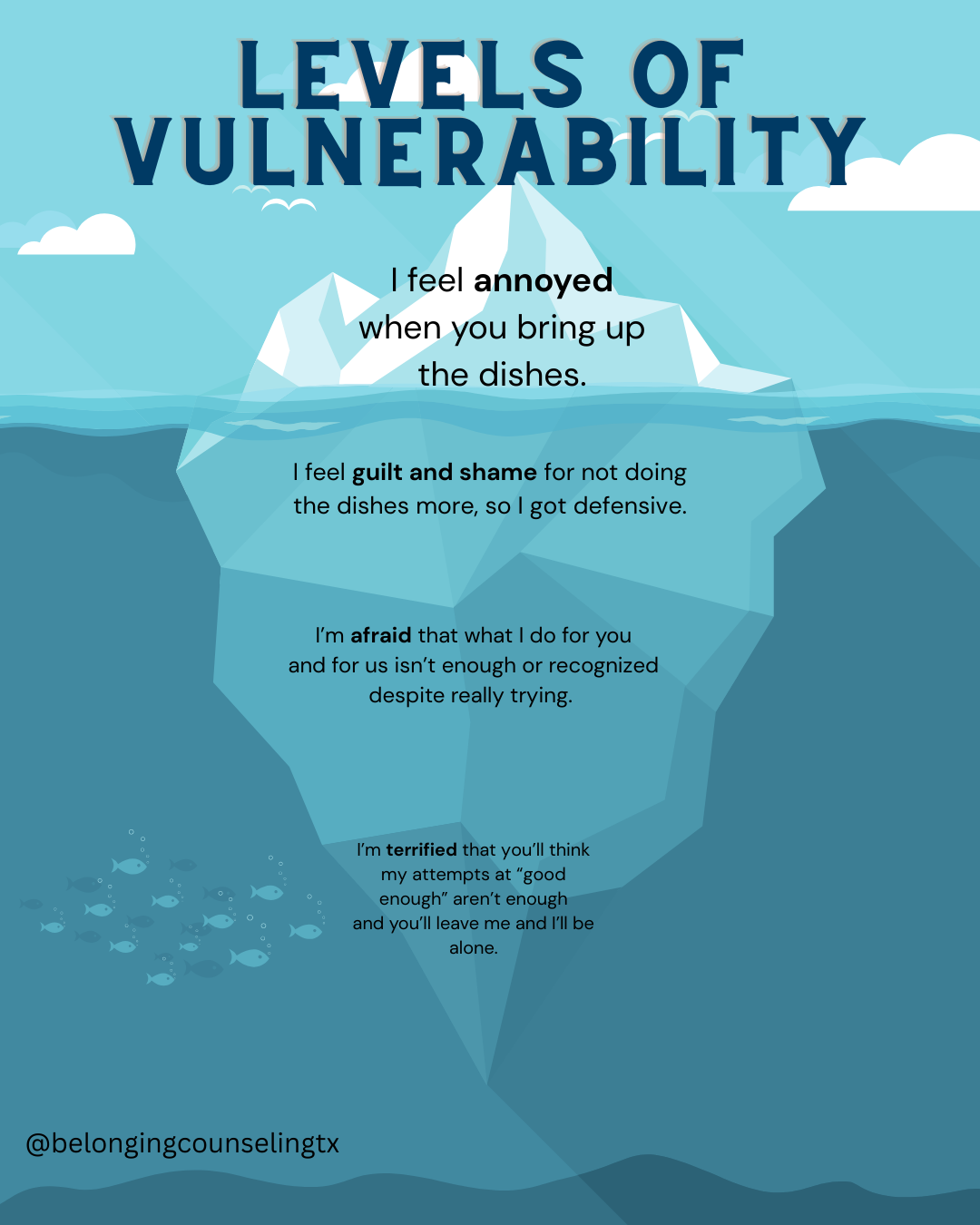 If you find yourself needing support in “going deeper down the iceberg” of your relationship, consider checking out a couples therapist who specializes in EFT (Emotionally Focused Therapy). At Belonging Counseling, we specialize in EFT. If you’re interested in doing that work as an individual, we also specialize in issues around vulnerability. Reach out and schedule a consult with us today!